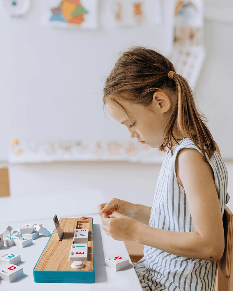 La station Lilémø, sans écran, guide l’enfant dans ses explorations : elle lit, questionne, corrige et stimule la compréhension orale, la lecture, l’écriture, et l’acquisition du rôle d’élève.